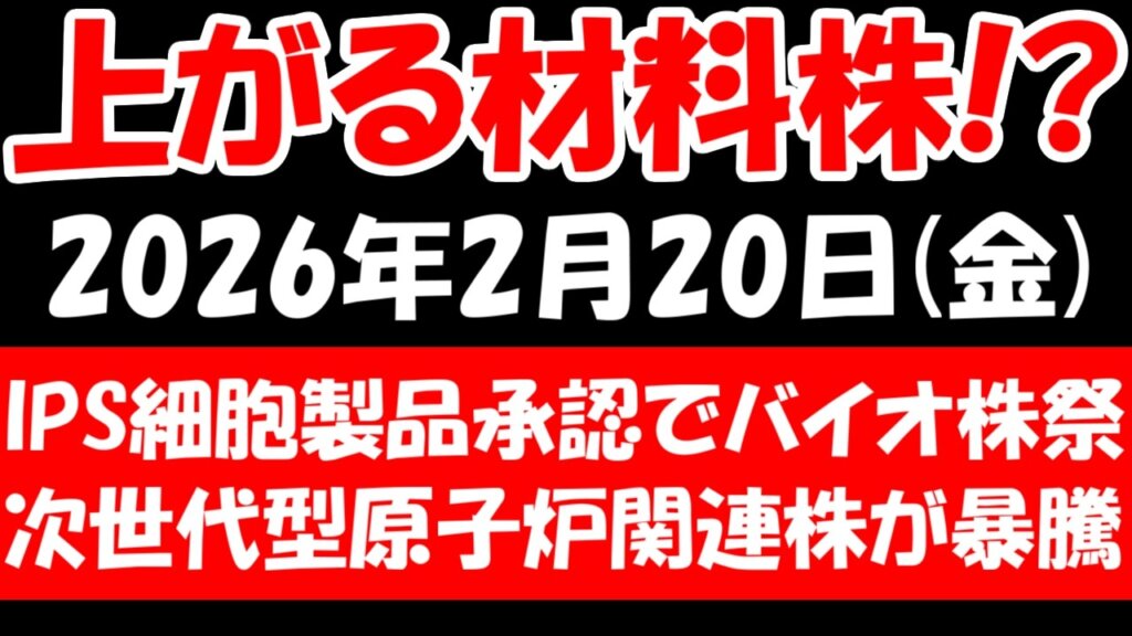 2026年2月20日 日本株最新情報|IPS細胞承認でバイオ株急騰と次世代原子炉関連株ストップ高の背景