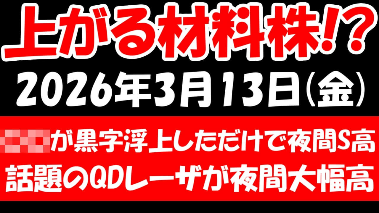 【材料株速報】黒字転換で夜間ストップ高!QDレーザも急騰、2026年3月13日日本株の注目銘柄まとめ