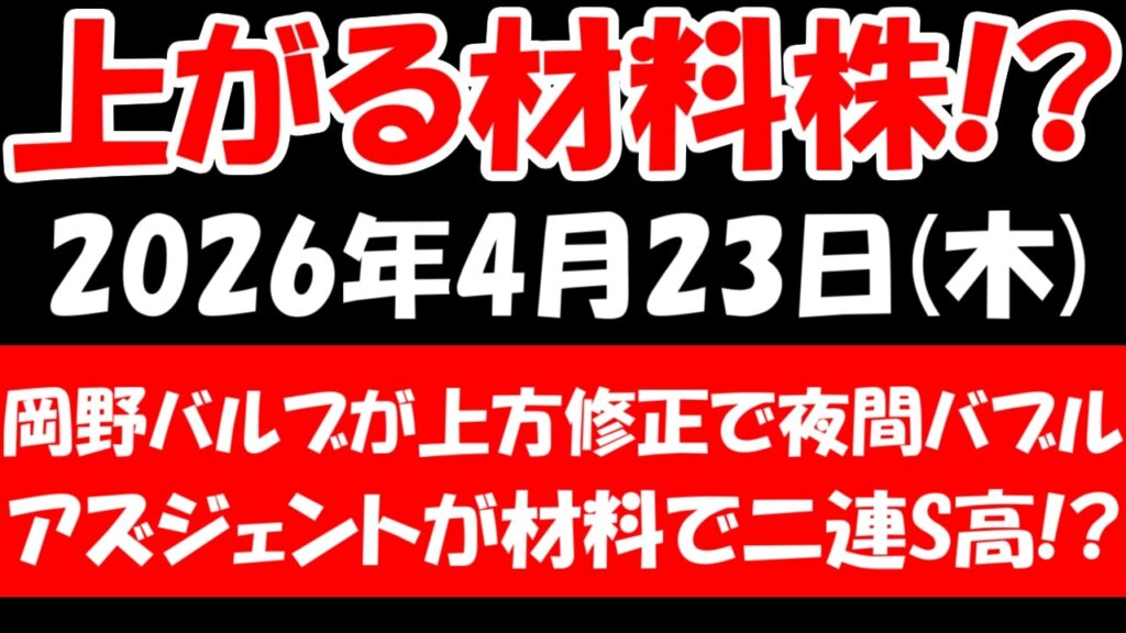 【2026年4月23日注目の日本株】岡野バルブの上方修正とアズジェント連続ストップ高は続くのか、材料株の行方を詳しく解説
